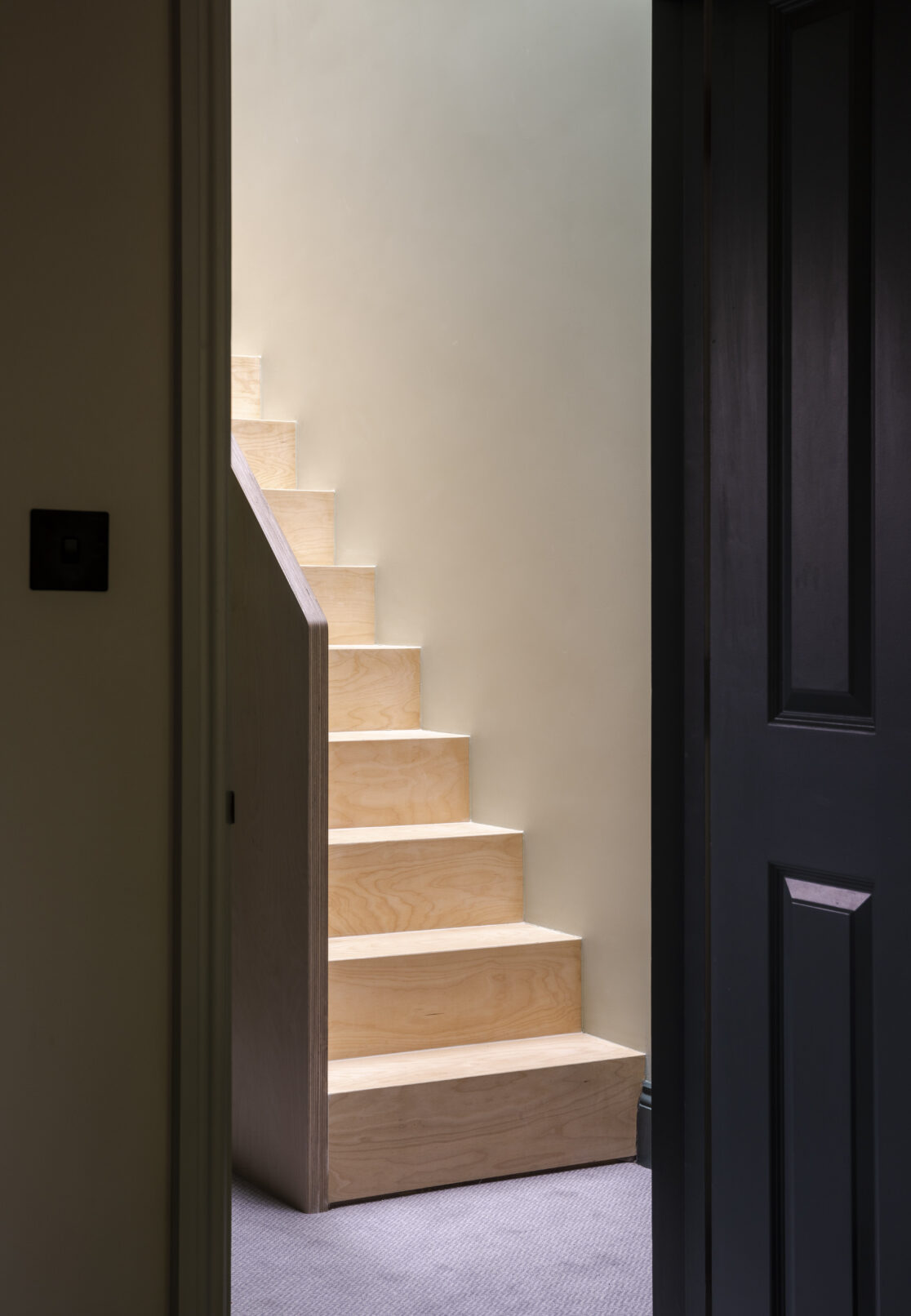 Throughout the project the refurbishment is deliberately understated, the first floor is a sympathetic refurbishment, enhancing the character of the original architecture to create welcoming and comfortable accommodation. The new loft extension is deliberately modern, left simply white and crisp, the new staircase to access this floor is built from birch plywood, with solid balustrade.