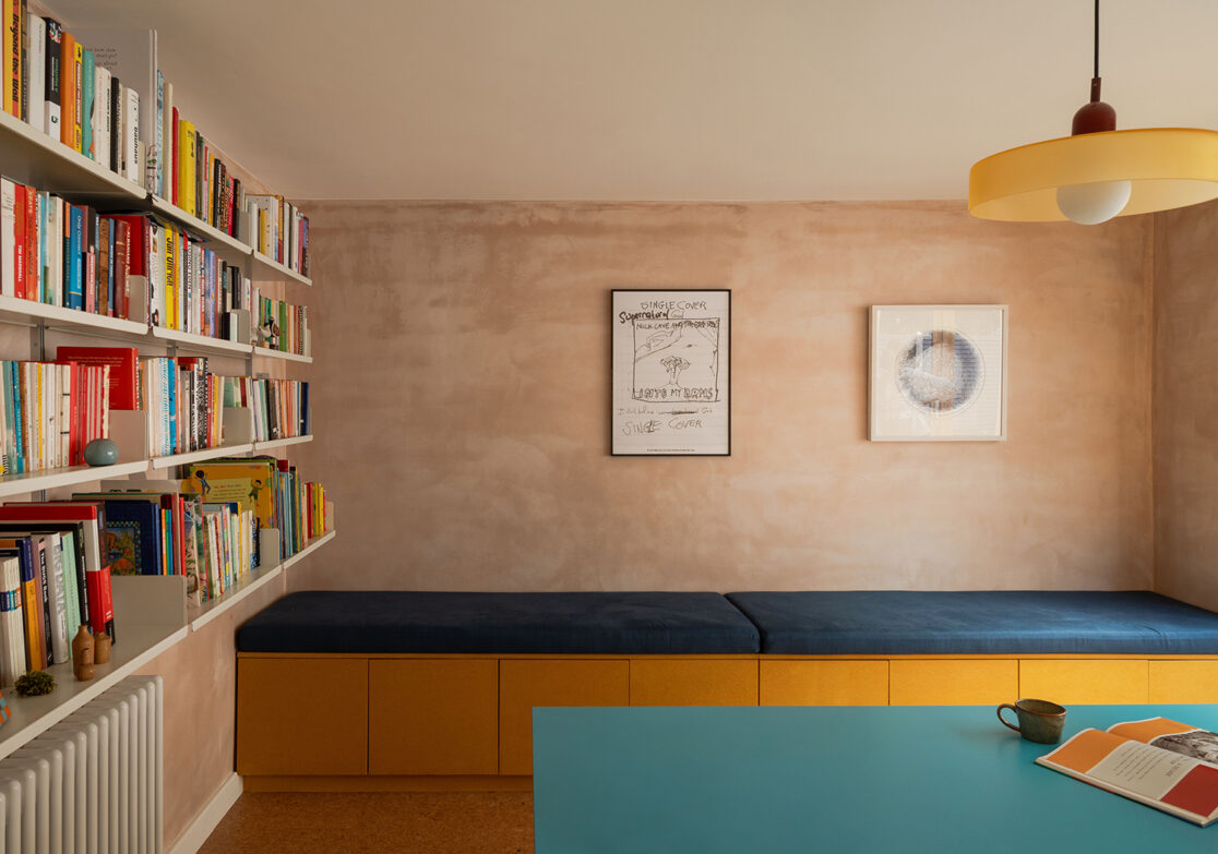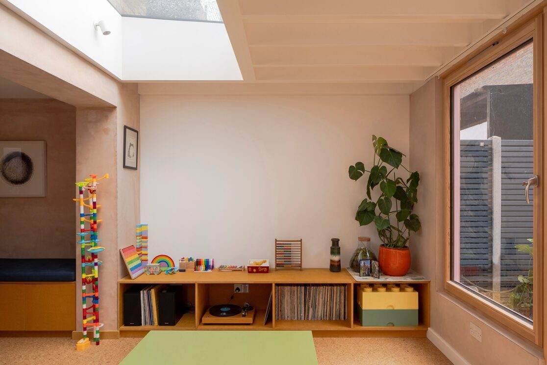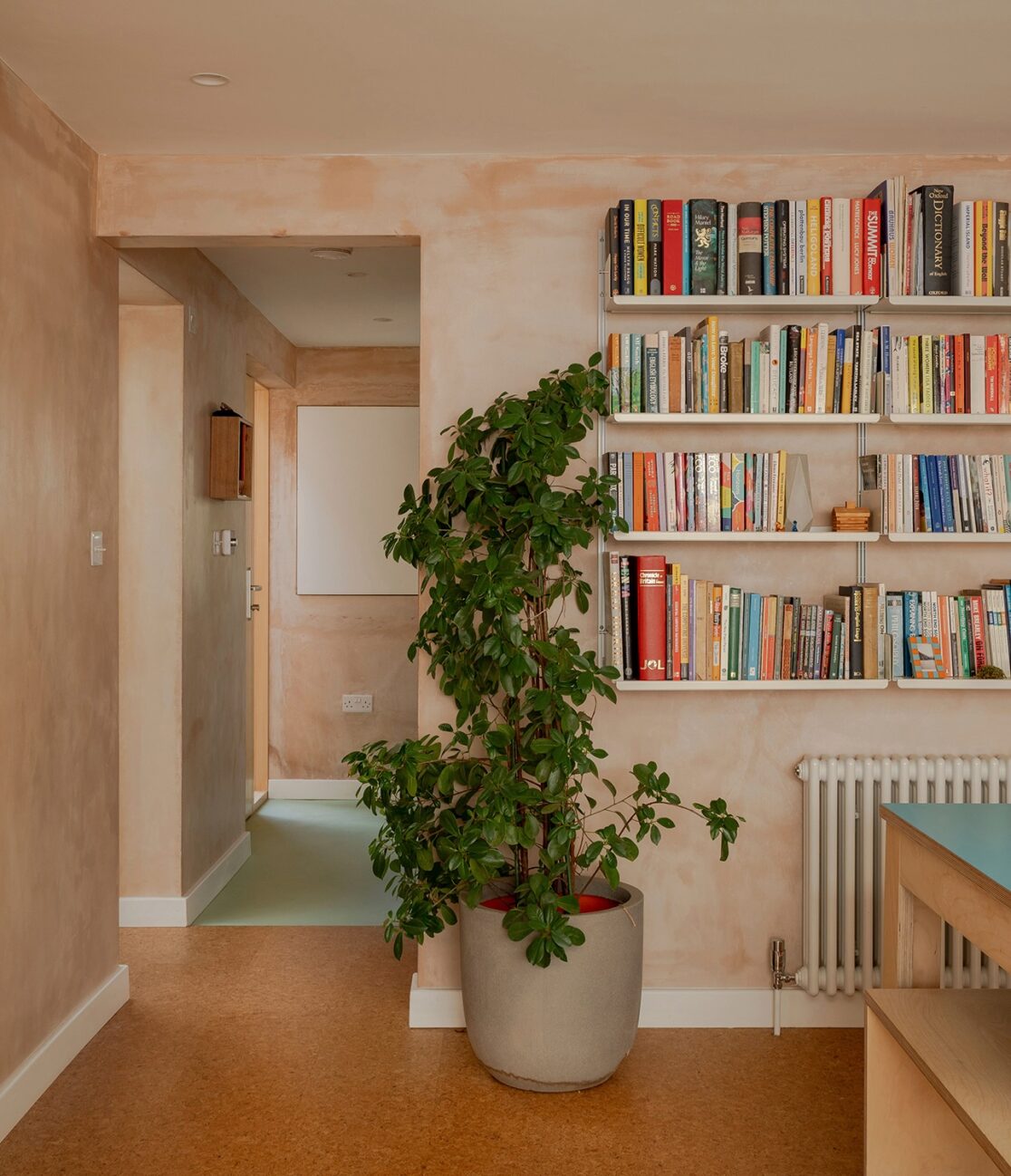 Cork flooring is used predominately throughout the ground floor, internally the windows are finished with a clear lacquer and the walls are left with a raw plaster finish, bringing a natural warmth and texture throughout the interior.