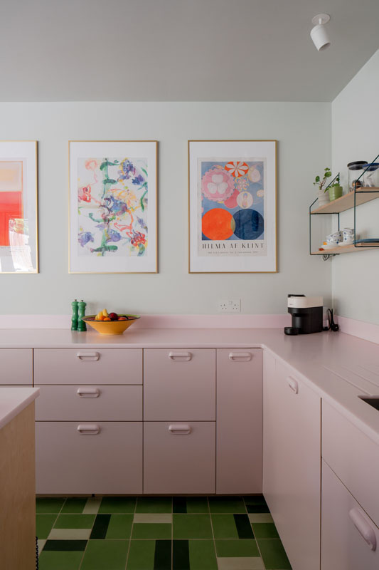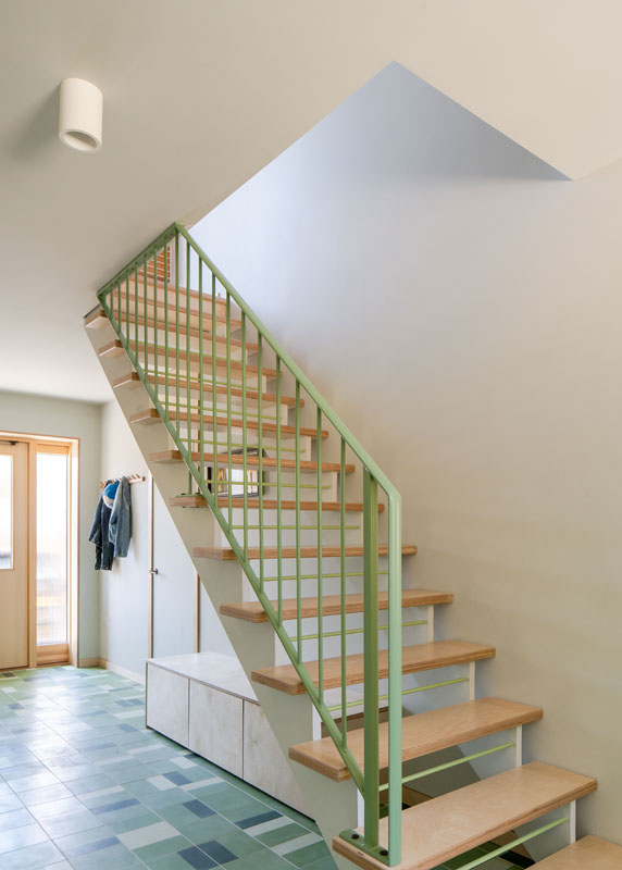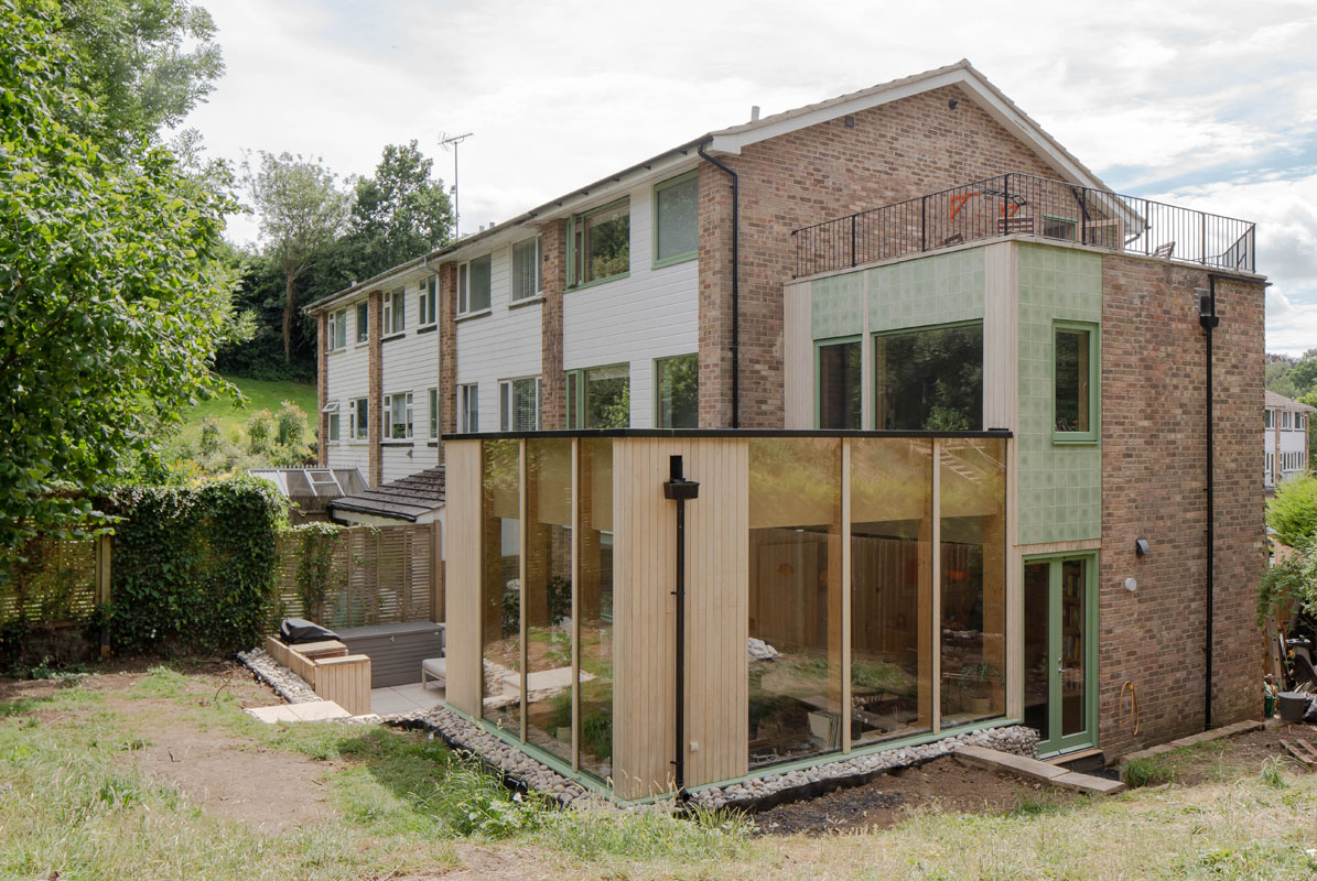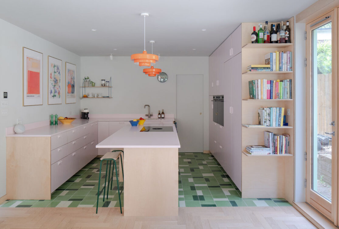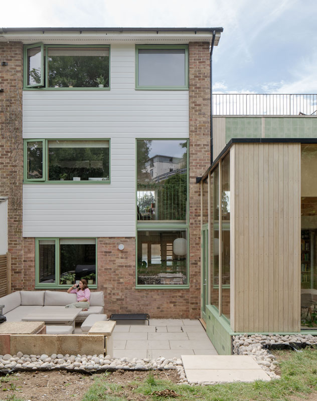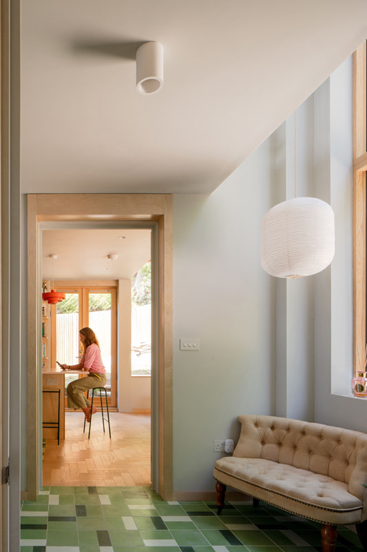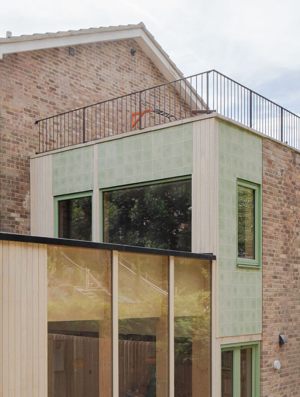 Externally the new extension is an expressed timber frame and has been finished with encaustic tiles and accoya timber cladding while internally a light sage green pallet runs through the refurbished elements of the house.