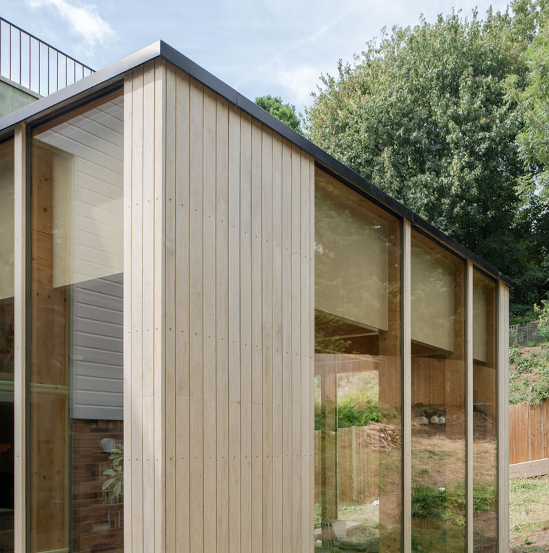 An existing 1980s two-story extension follows the boundary line, which has been extended to the rear with a timber framed pavilion type glazed extension offering views into the large garden which surrounds the property to create a light filled warm and welcoming family living space containing a new kitchen, pantry, dining and seating space opening onto a rear terrace.
